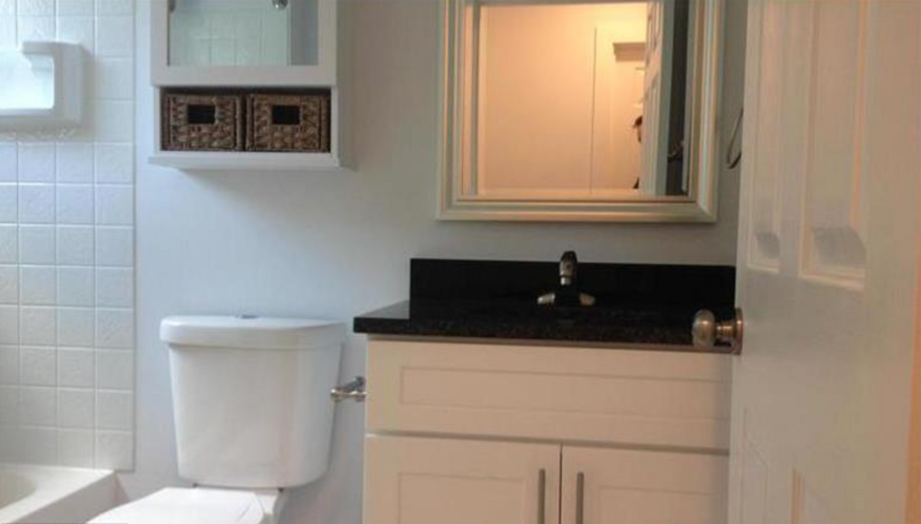 A contemporary kitchen and updated bathroom